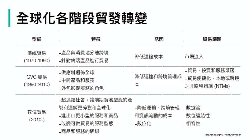 這就是問題所在了,而這也是主其事者第一個要問自己的問題。為甚麼十年來沒什麼變化?為什麼二十年來會變化不大?台灣這二十年來變化有多大?全球的產業鏈分工有多大的變化?台灣主要貿易夥伴,在各種進出口商品和跨境服務的貿易額,變化是什麼?1970年代只要對美國和日本,對外貿易就足矣。1990年代大量產業西進,主要的貿易夥伴又多了幾個高成長的經濟體,產業和產業聚落開始外移。2010年後全球貿易變得更為複雜和碎裂,比如說,就以數位貿易 (digital trade) 為主,其貿易形態和 (a) 1970年~1990年 (b) 1990年~2010年的兩個20年期,就有截然不同的特徵。最大的改變是「超連結 (hyperlink)」的社會所帶來: