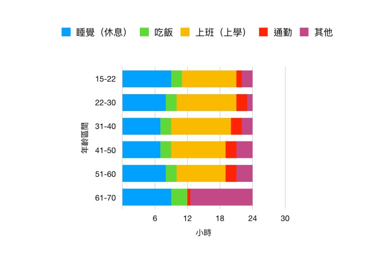 以上當然是根據經驗的猜測,但我們可以進一步從整體人口的每日作息,以跨度比較大的年齡層作為調查的間距,推敲國民每日生活作息的時間分佈大致如何。