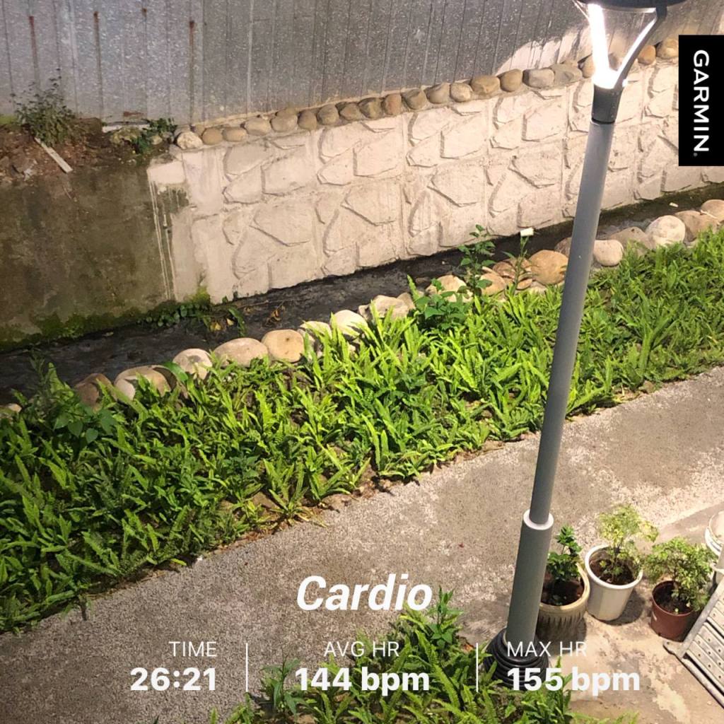 我把手錶開了 “cardio" 模組,紀錄身體的數據。天氣炎熱需要補水,整體比預定時間慢了81秒完成。完成後休息兩分鐘,再跑個3公里緩和。90分鐘不包含(熱身和伸展收操)很快的結束,身上鞋面也都是紅土灰塵的痕跡。