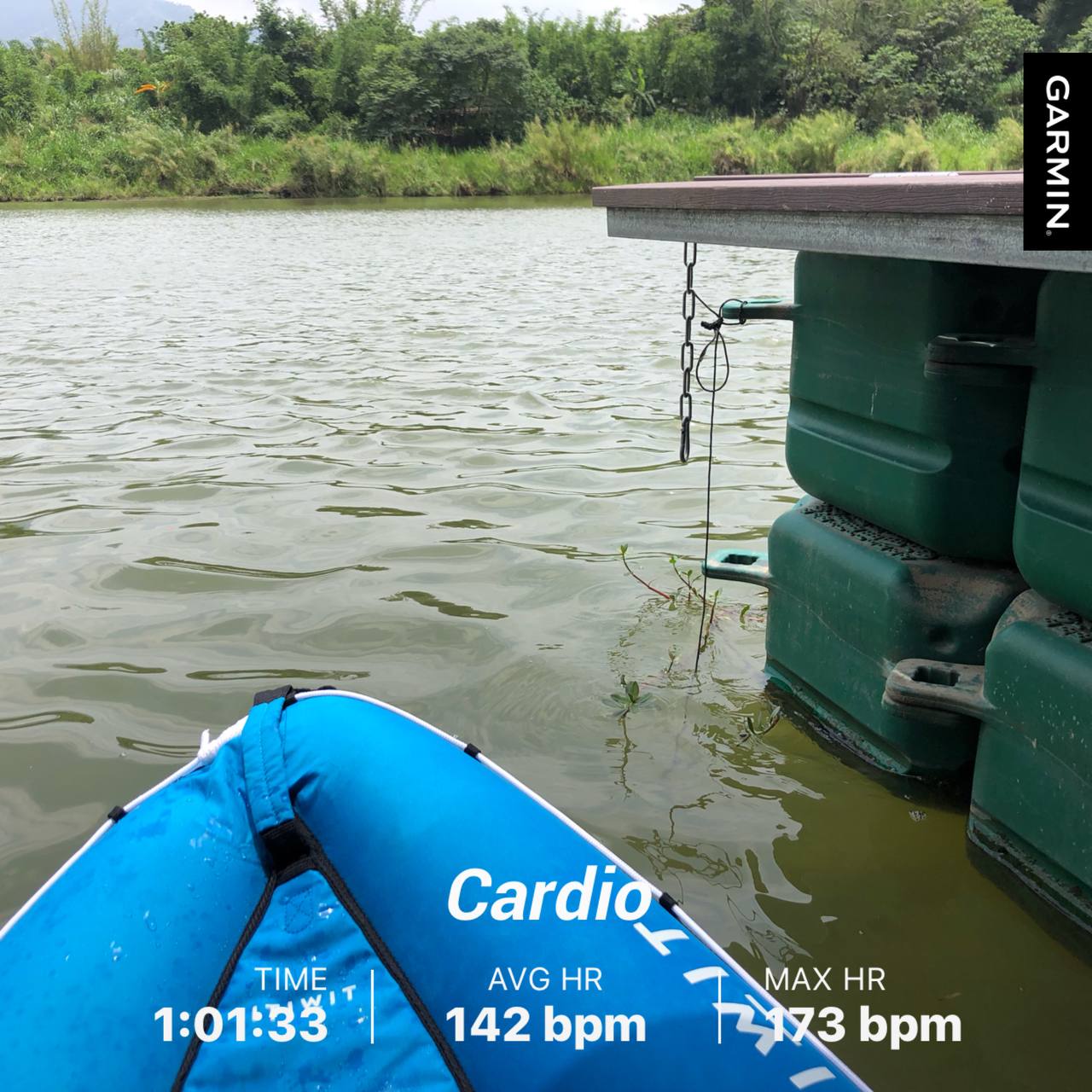 滑一個小時是會累的,我抓的目標是順利的前進,槳入水怎麼抓上身旋轉的節奏。這是皮筏,只有一支兩頭都要使用的槳,槳也是選擇最便宜的款式。這樣是訓練人體空間感受和發力順序的好組合。悠閒的強度很 OK,想不悠閒用上蠻勁?對不起辦不到,會不穩定很快落水。