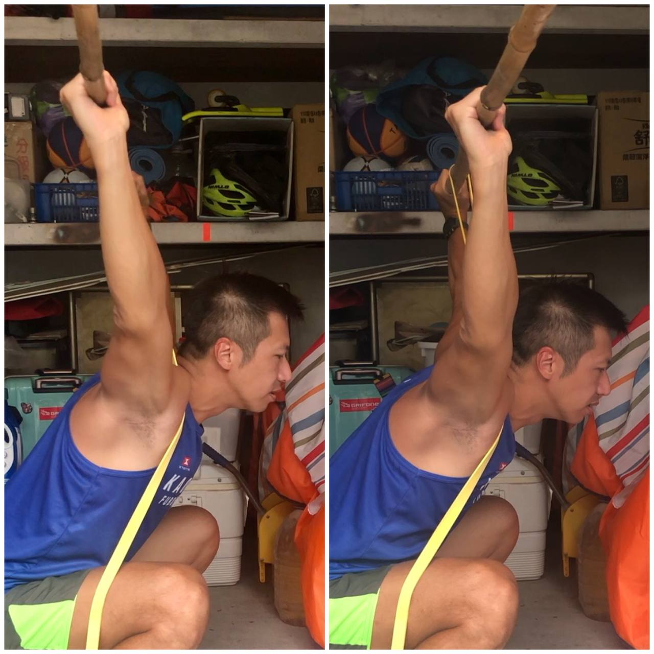 我同樣安排一小時左右,再抓10分鐘整理運動收操。感覺還不錯,而且今天氣溫較前幾天低很多(白天約26度),做起來特別舒暢。每一組的次數做16到24下,揣摩阻力繩搭配竹槓有什麼不一樣。至於單純用阻力繩做動作就比較常見,我也不多說這一部分。不過我要推薦一下在家也可以用阻力繩做的不少舉重前的熱身動作。