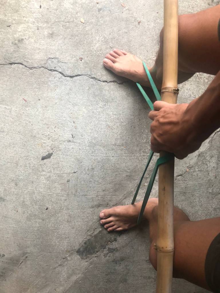 前幾天準備的竹棍現在派上用場。這竹棍被我切成奧槓的長度,周徑左右不太均勻,但還算好握。主要是沒有負重,都用阻力繩模擬重量。掛上阻力繩的動作和一般自由槓雖然接近,但在離心發力的感覺是完全不一樣的。初始負荷低,遠心到動作行程一半時阻力慢慢增加,到最後頂點則是阻力最高。這樣的阻力特性對於發力會有什麼影響?對於訓練會有什麼好處?我也沒有答案。但今天是練背和肩,我先掛一條輕的阻力繩,等身體熱了之後,再掛另外一條阻力稍大的。最後練到擴背的划船動作,就兩條一起上。