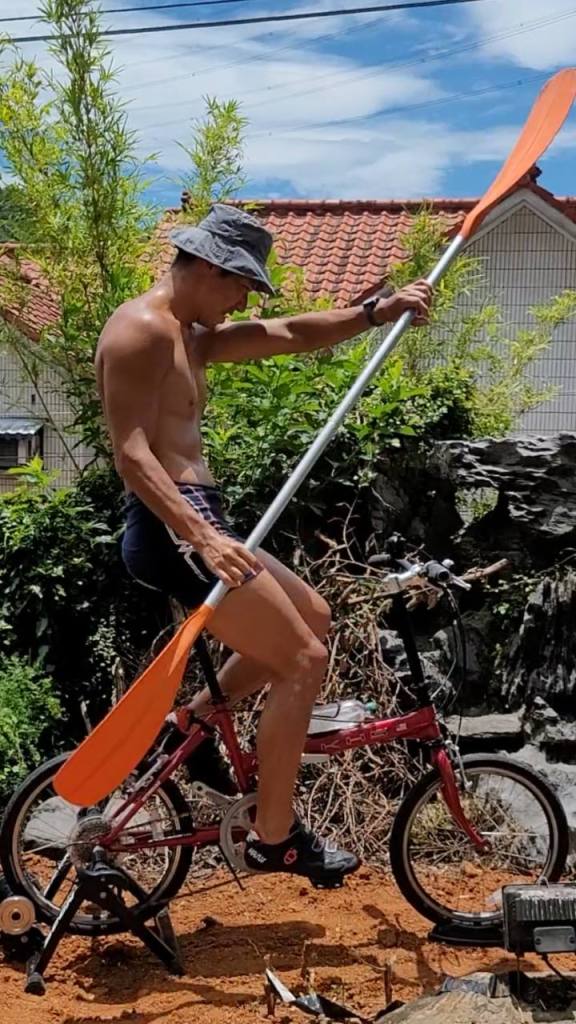 各位看照片就知道,這個槳不是划龍舟用的,相對來說比較輕盈。而座下的訓練台很常見,但一邊騎車一邊划船,這就比較少見了。我傾向說這是某種「惡搞」而不是訓練,但你邊騎車邊划槳試試看,一個小時是會累的。而且姿勢幾何整個不對,騎車不對,划船也不對,要保持節奏踩上一個小時,會有點難度。