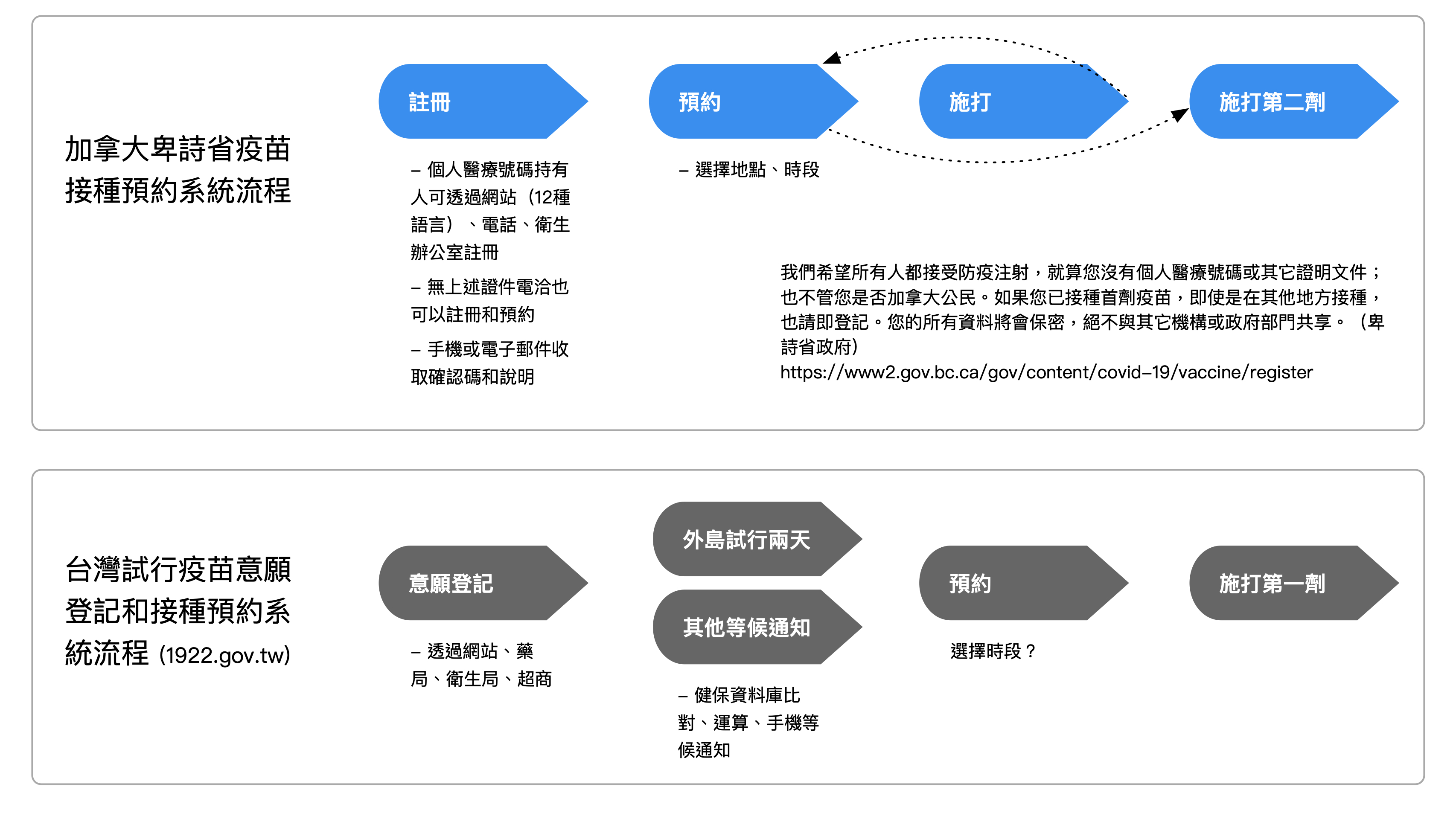 這一張也只是概念圖。當然一邊是加拿大的卑詩省 (British Columbia),另外一邊是台灣。我抓出加拿大卑詩省官方登記網站和台灣現行的「公費疫苗預約系統」不同的部份: