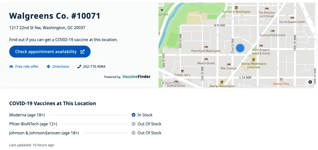 OK 速度很快。我先截圖上半頁。可以看到聯絡方式、疫苗品牌存貨種類、存貨資訊最後更新日期、是否和共享租車合作提供免費的叫車服務。其他下半頁(這裡沒有截圖)的資訊有:是否接受現場預約和接種、接種地點的營業時間,其他備註的訊息等。