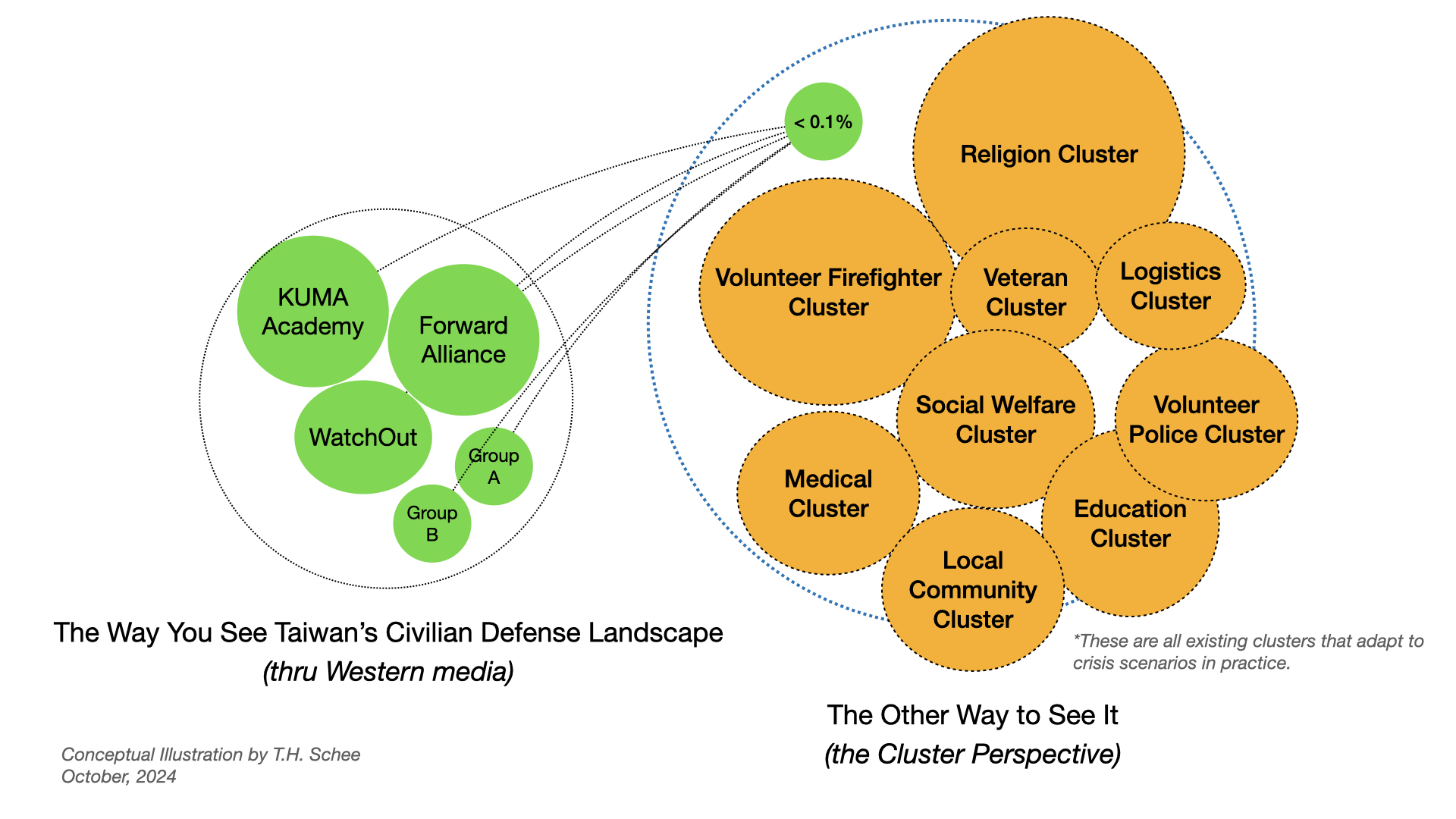 I am often asked about the state of civil defense in Taiwan, yet friends who know me well understand that it’s difficult to highlight just one or two specific groups to capture the full picture. Most emerging “civil defense organizations" are oriented toward education and outreach, yet they rarely possess substantial organizational or mobilization frameworks. Taiwan has a range of established disaster response organizations, but in the eyes of Western media, few—aside from Tzu Chi—have garnered adequate research or recognition. These fragmented portrayals hinder a comprehensive understanding of Taiwan’s civil defense landscape. To aid further discussion and help direct the right resources to the most fitting organizations, I’ve created this chart as a reference point.