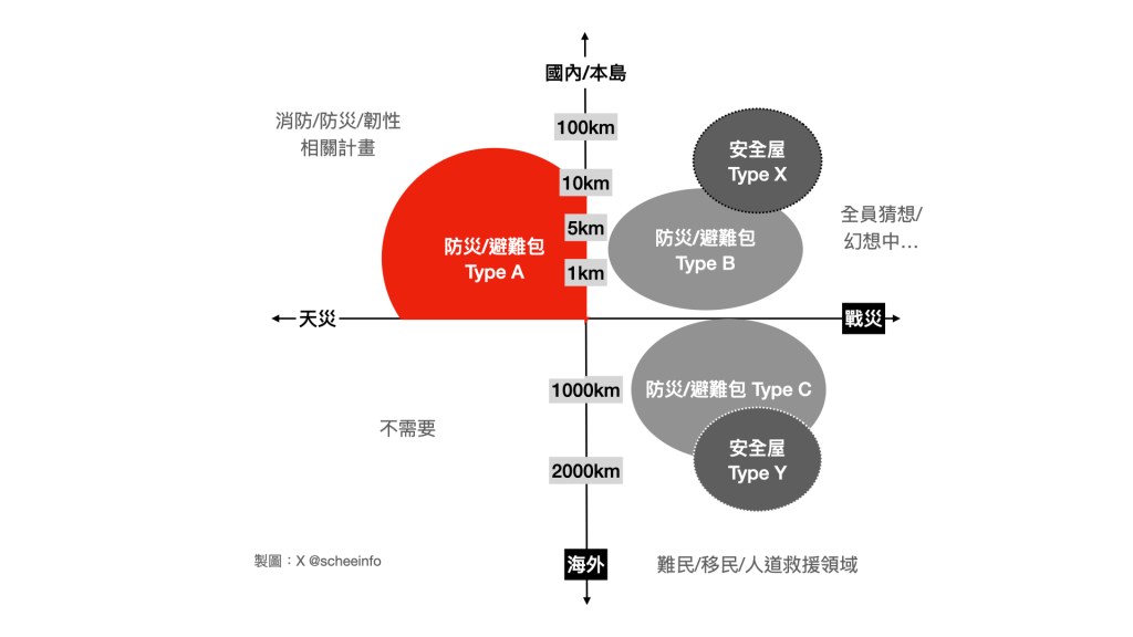 如果以上的答案全部是否定,那麼需要移動時,你要照顧自己還是要照顧什麼樣的家人?就算是不考慮我們最有經驗和不幸最有機會遇到的天災,那麼戰災的避難型態有哪些?在台灣會遇到嗎?遇到你就需要防災包/避難包嗎?
