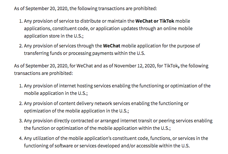 - 連帶的,任何透過 WeChat 和 TikTok 提供「美國境內使用者」服務的所有第三方合作商和軟體開發者,也要在兩天之內做出反應。這部分對台灣整體社會的影響比較難用一篇短文說明,但透過 WeChat 經營顧客關係管理和提供服務,如透過「小程序」的任何商家,如果有客戶在美國境內,都在影響之列。