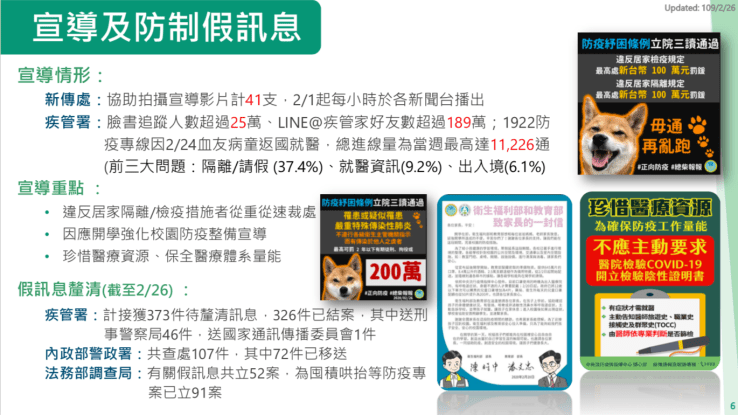 警方再次呼籲民眾勿隨意製造、散布或轉傳涉及新型冠狀病毒肺炎疫情之不實、未經查證之訊息,是類案件於抗疫期間必依法速查嚴辦。另請民眾全力配合政府相關防疫措施,相關資訊可上疾管署網站查詢最新公告內容,並可加入衛生福利部疾病管制署之「疾管家」官方LINE帳號,接收最新的疫情及防疫知識;還可透過「美玉姨」、「My Go Pen」等網路訊息查證平臺辨識訊息真偽,全民一體共同防禦新型冠狀病毒感染之肺炎可能帶來之危害。